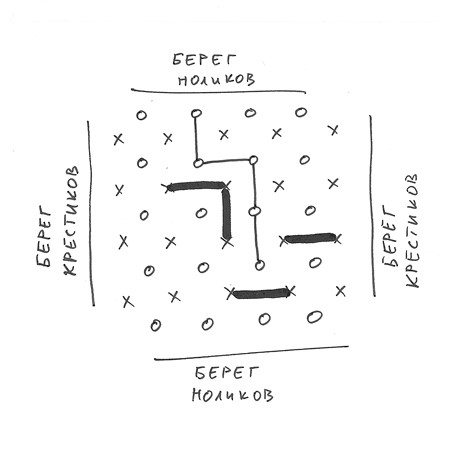 Мостики. В ходе игры каждый из игроков старается построить мост с одного своего берега на другой. У Красного — красные берега и крестики в качестве камней, у Зеленого — зеленые берега и нолики. Игру можно начинать в любой точке поля. За один ход игрок может соединить два своих соседних камня вертикальным или горизонтальным мостиком. Красные и зеленые мосты пересекаться не должны. Выигрывает тот, кто построит непрерывный мост с одного своего берега на другой.
