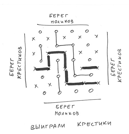 Мостики. В ходе игры каждый из игроков старается построить мост с одного своего берега на другой. У Красного — красные берега и крестики в качестве камней, у Зеленого — зеленые берега и нолики. Игру можно начинать в любой точке поля. За один ход игрок может соединить два своих соседних камня вертикальным или горизонтальным мостиком. Красные и зеленые мосты пересекаться не должны. Выигрывает тот, кто построит непрерывный мост с одного своего берега на другой.