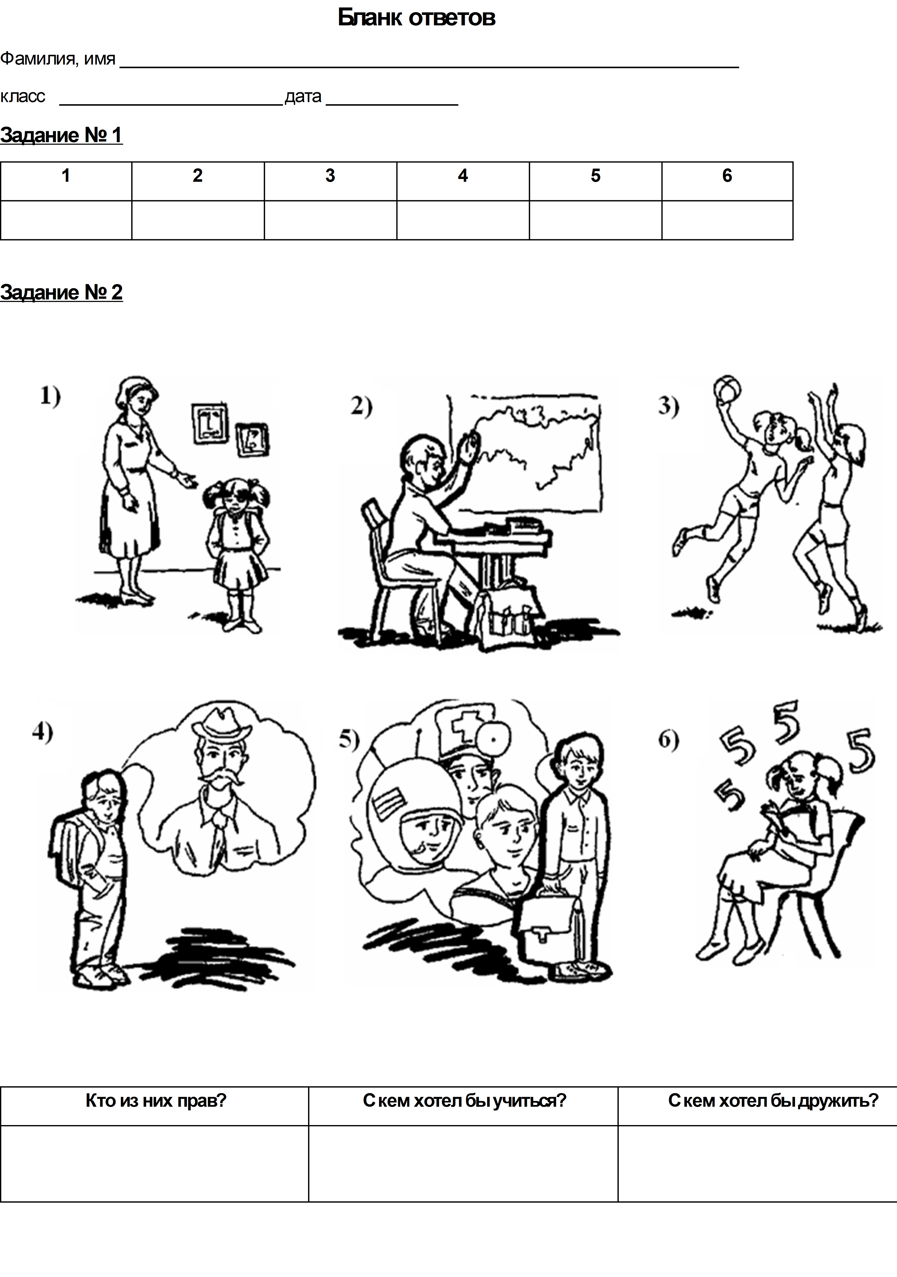 Здравствуйте ребята! Меня зовут… Я школьный психолог, и сегодня я проведу с вами занятие. Посмотрите у вас на партах лежат листочки, точно такой же листок у меня в руках (психолог показывает детям бланк ответов – образец). Мы будем выполнять разные задания в этих листочках. Но сначала я объясню вам как. Работать мы будем все вместе. Пока я не объясню, что надо делать, никто не берет карандаш и не начинает работать. Перед каждым заданием я буду рассказывать вам, что и как надо делать, что-то буду показывать на доске. Только после того как все вы поймете задание, я скажу «приступайте» и вы все вместе начнете его выполнять. Во время занятия разговаривать нельзя, каждый выполняет свою работу самостоятельно. Если что-то вам непонятно поднимите руку я подойду.