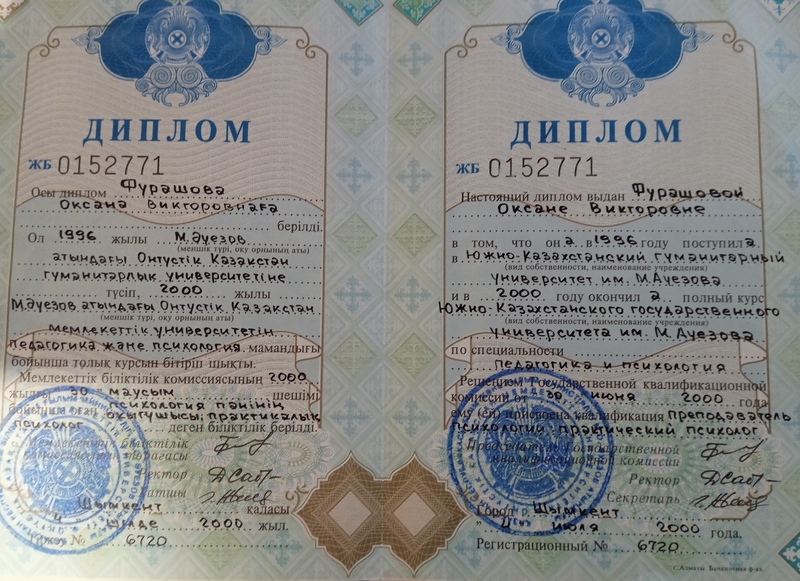 Южно - Казахстанский государственный университет им. М. Ауезова, специальность: педагогика и психология; квалификация- преподаватель психологии, практический психолог.