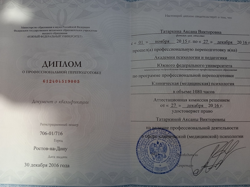 Академия психологии и педагогики Южного федерального университета по программе профессиональной переподготовки Клиническая ( медицинская) психология.